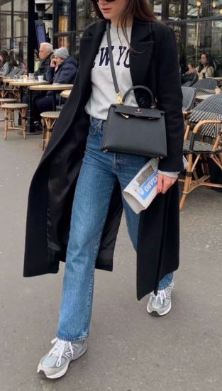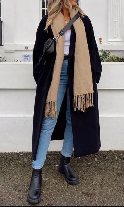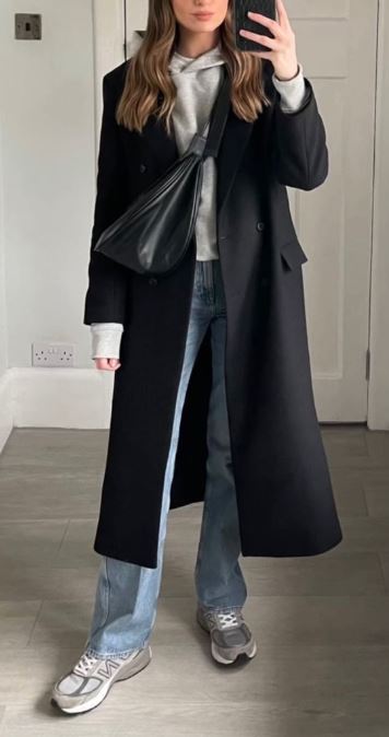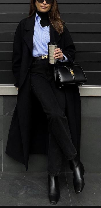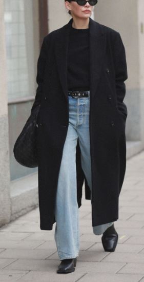 یک شلوار جین ساده با پالتوی بلند مشکی، ترکیبی همیشه مدرن و مناسب استفاده روزمره است.