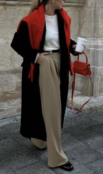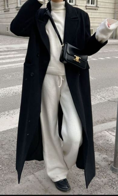 شلوار سفید گشاد با بلوز یقه اسکی و پالتوی مشکی، تضاد رنگی زیبا و استایلی مینیمال و شیک خلق میکند.