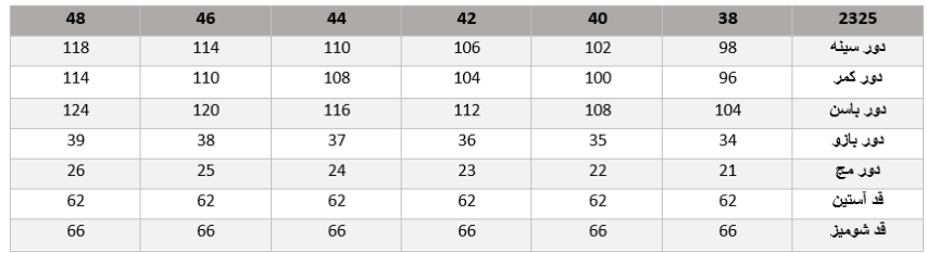 اندازه ها بر اساس سانتی متر میباشند و ممکن است 1 الی 2 سانت متغیر باشند.